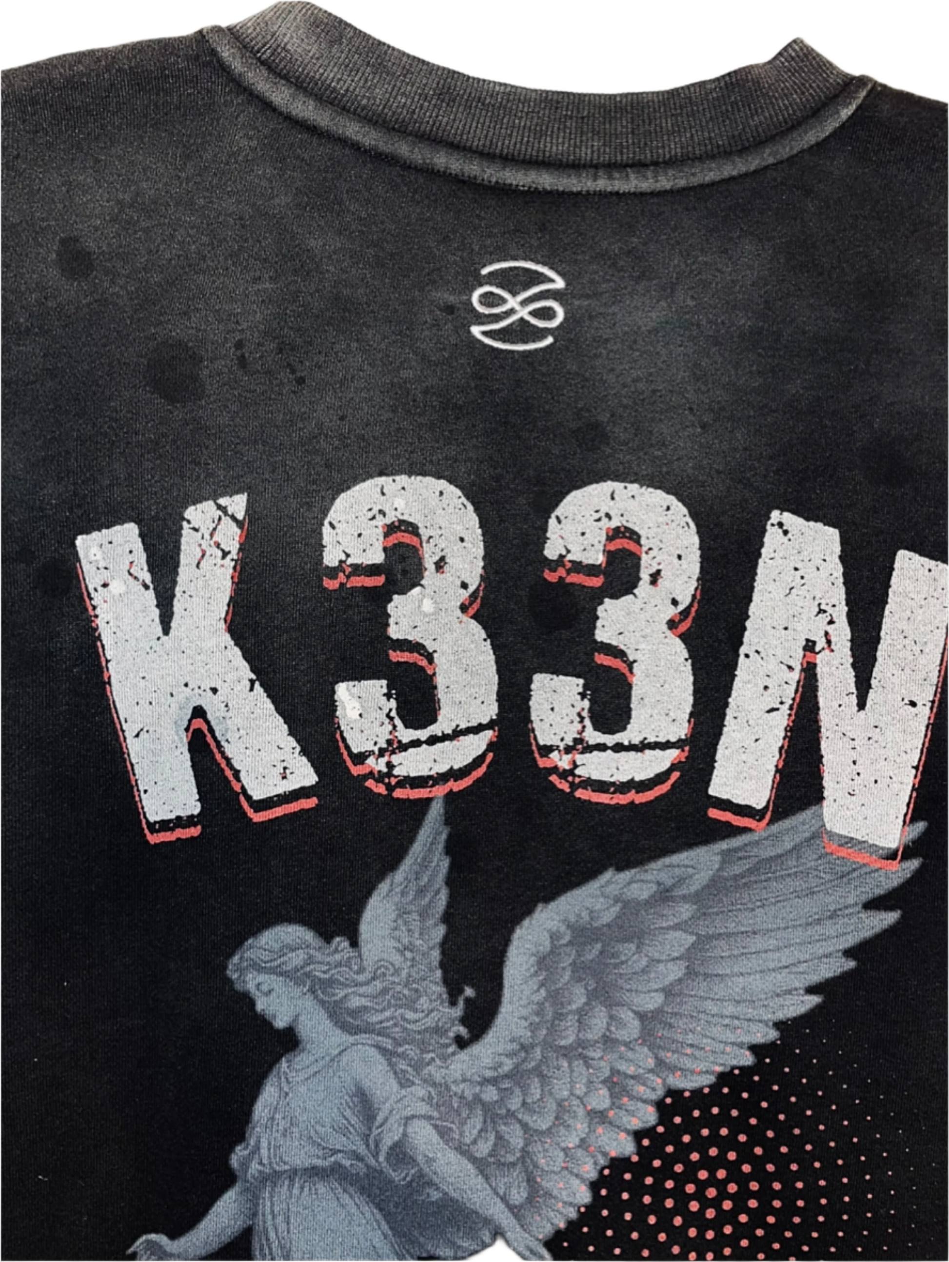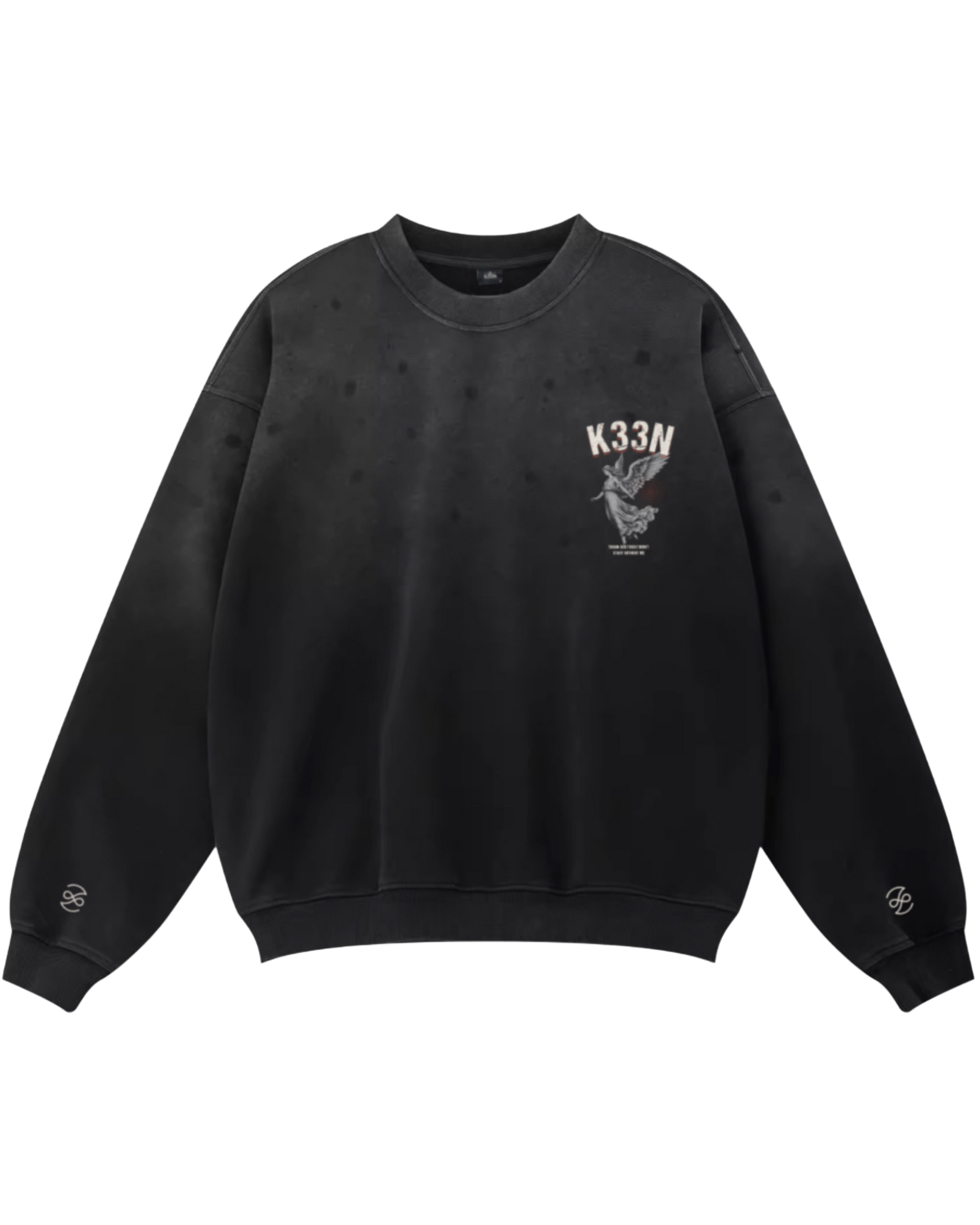 From the Guardian Angel collection comes this light weight sweatshirt in an oversized boxy fit. Crafted from light weight French terry cotton with a fade out wash. The sweater features a mix of direct to garment print to withstand multiple washes along with embroidery on the small sleeve & back logos. It is finished with vintage stitching and nibbling details to the hems, with subtle paint splatters.